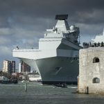 Here’s the carrier heading past Portsmouth’s Spinnaker Tower, with tugboats and a police escort.
