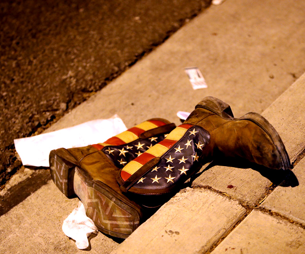 A pair of cowboy boots is shown in the street outside the concert venue after a mass shooting at a music festival on the Las Vegas Strip in Las Vegas, Nevada, U.S. October 1, 2017. (Steve Marcus/Las Vegas Sun/Reuters)
