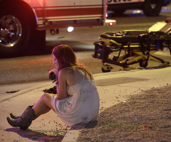A woman sits on a curb at the scene of a shooting outside of a music festival along the Las Vegas Strip, Monday, Oct. 2, 2017, in Las Vegas. (John Locher/AP)