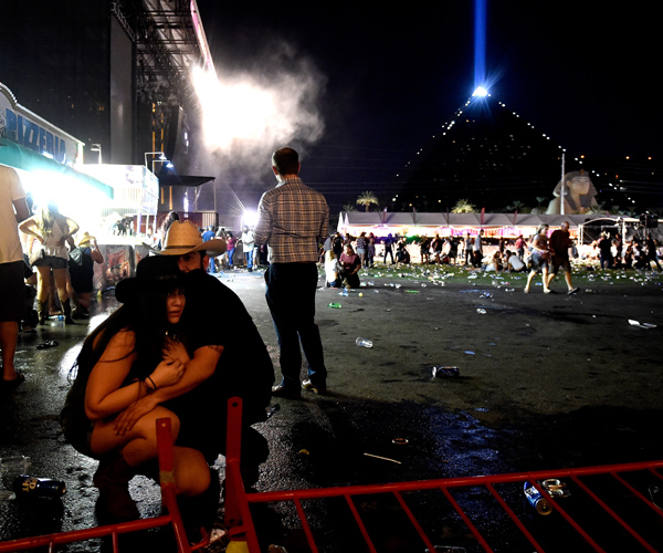 People hug and cry outside the Thomas & Mack Center after a mass shooting at the Route 91 Harvest country music festival on October 1, 2017 in Las Vegas, Nevada. (Ethan Miller/Getty Images)
