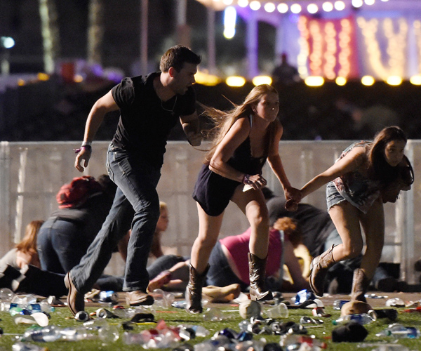 LAS VEGAS, NV – OCTOBER 01: People run from the Route 91 Harvest country music festival after apparent gun fire was hear on October 1, 2017 in Las Vegas, Nevada. A gunman has opened fire on a music festival in Las Vegas, leaving at least 20 people dead and more than 100 injured. Police have confirmed that one suspect has been shot. The investigation is ongoing. (Photo by David Becker/Getty Images)