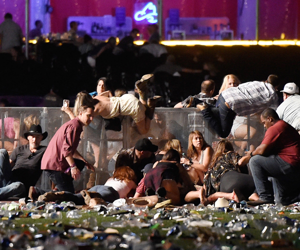 LAS VEGAS, NV – OCTOBER 01: People scramble for shelter at the Route 91 Harvest country music festival after apparent gun fire was heard on October 1, 2017 in Las Vegas, Nevada. A gunman has opened fire on a music festival in Las Vegas, leaving at least 20 people dead and more than 100 injured. Police have confirmed that one suspect has been shot. The investigation is ongoing. (Photo by David Becker/Getty Images)