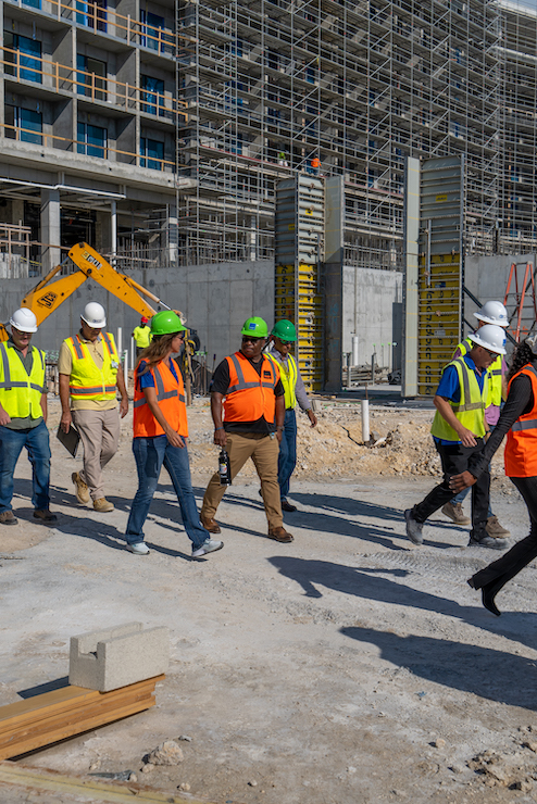 Members of the Dart construction team and Chief Officer Wesley Howell, Ministry for Border Control and Labour, during a walkthrough of the Hotel Indigo construction site.