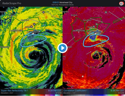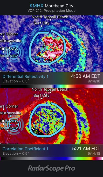Birds in the eye. Low correlation coefficient = non-met/biological scatterers. High Zdr somewhat a reflection of their wingspan. #Florence #Ncwx