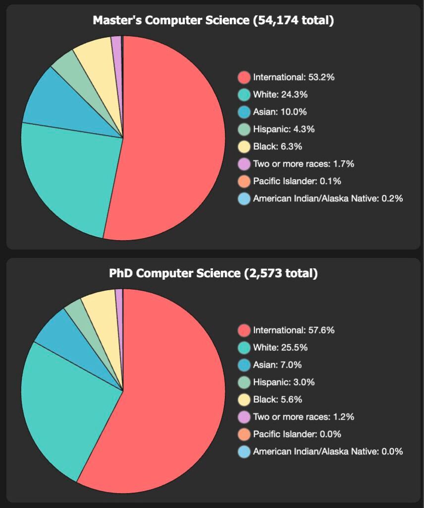 In short, 60% of CS PhDs in the US are not American. 53% of CS Masters grads in the US are not American. Immigration has been the backbone of U.S. innovation for decades. How about Unicorn founders? As you probably know, nearly half of US Unicorn Founders were born outside the US ¹⁴. The U.S. is on the path to a technological dark age that is highly likely to further hurt and inflict pain on the the U.S. economy, labor market and the prospects of our most important resource, young people.