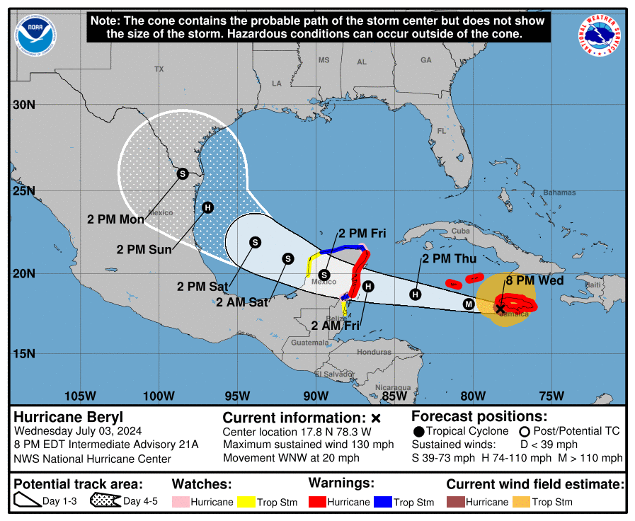 As of 7:00 p.m., Hurricane Beryl was located 215 miles East Southeast of Grand Cayman. The hurricane is exhibiting maximum sustained winds of 130 mph and is moving West Northwest at a speed of 20 mph.