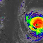 Figure 1. Infrared satellite image of the Southeast U.S. coast (left) with Hurricane Florence (right) at 8:57 pm EDT Tuesday, September 11, 2018. Image credit: NASA/MSFC Earth Science Branch.