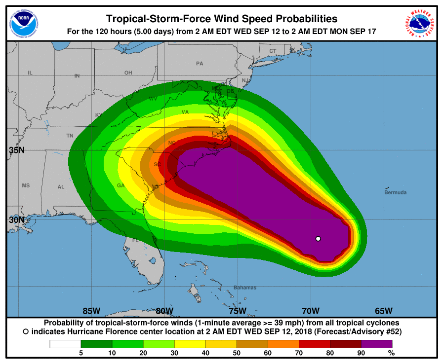 Florence was again on the upswing in intensity late Tuesday after its strength was briefly dented Monday night by an eyewall replacement cycle, as explained by Dr. Jeff Masters in our previous post. A new, larger eye (about 30 miles across) is now in place, and that will allow the hurricane’s wind field to expand as well. Satellite images on Tuesday night showed that Florence was still adjusting to its new eye, and had an asymmetric shape with a relatively thin area of heavy thunderstorms on the southwest side. Florence’s top sustained winds were raised to 140 mph by the National Hurricane Center at 5 pm Tuesday. Sustained hurricane-force winds now extend up to 60 miles out from Florence’s center, and tropical-storm-force winds extend out 175 miles. These numbers may grow even larger as Florence matures and expands. At its current size, Florence rates as an average-sized hurricane.