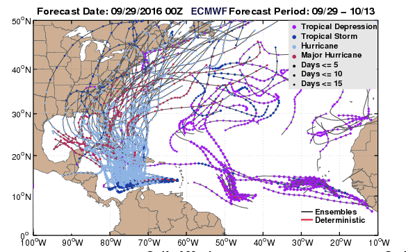 Figure 2. The 70 forecasts from the 00Z Thursday European (ECMWF) model ensemble (top) and GFS model ensemble (bottom) showed a wide variety of solutions for the track of Matthew. The operational (deterministic) versions of the models, run at higher resolution, are shown in red lines. The two models have grown closer together in their solutions compared to Wednesday, but the European model still shows a considerably slower and more westerly track for Matthew than the GFS model.
