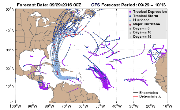 Huge differences continue in the longer-range model forecasts for Matthew. A large upper-level low pressure system has separated from the jet stream and will meander over east-central U.S. during the remainder of this week. The steering currents associated with this low are expected to be strong enough to pull Matthew sharply to the north by the weekend. This sharp turn is expected to occur on Friday night or on Saturday, and the exact timing of the turn has major implications for who experiences the peak wrath of the storm. An earlier turn is being predicted by the GFS model, with a landfall by the storm in eastern Cuba on Monday morning. Matthew is then predicted to move through the central Bahamas on Tuesday. The European model has Matthew heading northwards more than a day later than the GFS model, with a landfall in Haiti on Tuesday morning. As one can see from the latest set of ensemble model runs (Figure 2), the long-range uncertainties in Matthew’s long-range track are high. Hopefully, these forecast discrepancies will be resolved by Friday morning, when data from the NOAA Gulfstream-IV jet on the environment surrounding Matthew will be available. This aircraft (nicknamed “Gonzo”), whose dropsondes can improve track forecasts by as much as 20%, will make its first flight Thursday evening. It’s good to have “Gonzo” back, as it was down for extended maintenance in late August and early September due to a corrosion problem, and was not available at all during Hurricane Hermine.