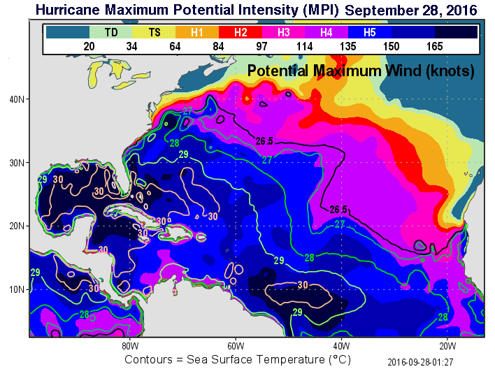 Figure 3. How strong could Matthew get? On rare occasions, when wind shear is low and dry air is absent, a hurricane will become a “perfect storm”, reaching the maximum potential intensity (MPI) that physics will allow. This maximum is a function of how warm the ocean is and how unstable the atmosphere is. Last year’s Hurricane Patricia, which intensified to 215 mph sustained winds over record-warm waters of 31°C (88°F) off the Pacific coast of Mexico, was one example of such a rare “perfect storm.” Hurricane scientist Dr. Kerry Emanuel of MIT has developed a relatively simple set of equations which will determine the approximate MPI of a hurricane, and real-time plots of this are available at wxmaps.org. In the case of Matthew, its MPI if it was in the region between Jamaica and Haiti today would be approximately 150 knots (170 mph), seen in the dark blue colors. If Matthew were in the northeast Bahamas, where ocean temperatures are warmer and the atmosphere more unstable, the MPI is higher, near 165 knots (190 mph), seen in black colors. These MPI numbers will change slightly when and if Matthew reaches these areas several days from now. Keep in mind that “prefect storm” conditions are difficult to achieve, and it is quite unlikely that Matthew will reach its MPI.