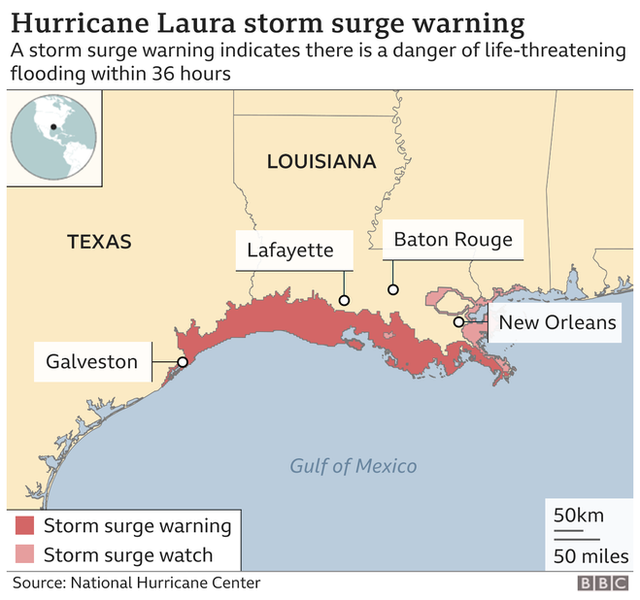 Laura and another storm, Marco, earlier swept across the Caribbean, killing 24 people.