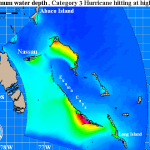 Figure 3. This Maximum Water Depth storm surge image for The Bahamas shows the worst-case inundation scenario for a Category 3 hurricane with 120 mph winds, as predicted using dozens of runs of NOAA’s SLOSH model. For example, if you are inland at an elevation of ten feet, and the combined storm surge and tide (the “storm tide”) is fifteen feet at your location, the water depth image will show five feet of inundation.