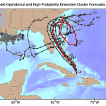 Figure 5. Track forecasts from the five European model ensemble members [gray lines] that most closely match the operational run [red line] during the first 72 hours, starting at 00Z Wednesday, October 5, 2016. The red line is a version of the 00Z Wednesday operational model track that has been adjusted and calibrated using a proprietary technique to account for systemic model errors. Five out of six of these forecasts show Matthew barely missing landfall along the Southeast U.S. coast, and all of them show Matthew failing to recurve out to sea to the northeast. Disturbingly, two of the tracks show Matthew looping back to punish The Bahamas and crossing South Florida to enter the Gulf of Mexico. The high-probability cluster (grey lines) perform better than other ensemble members at forecast times of five days and beyond. The black crosses along the Gulf Coast are the locations of oil wells, as this forecast tool was designed primarily for use by the oil and gas industry. Image credit: Climate Forecast Applications Network (CFAN).
