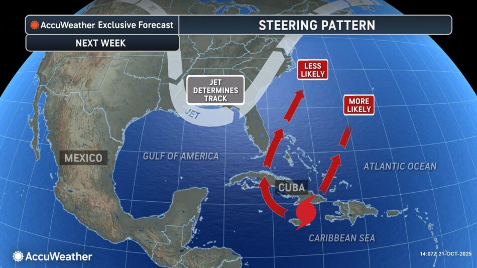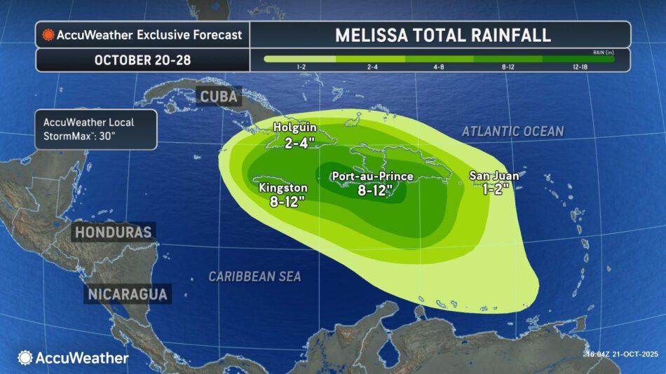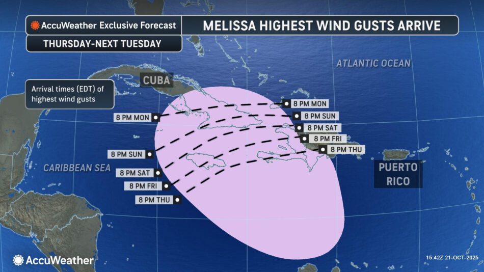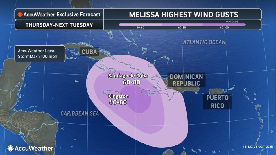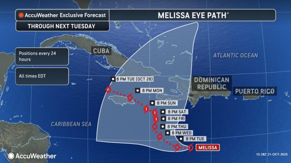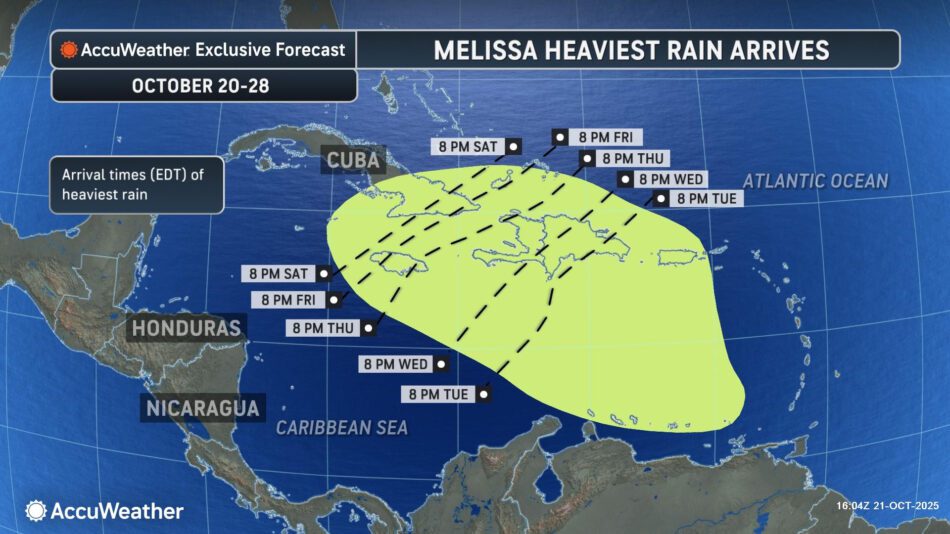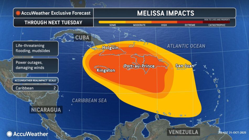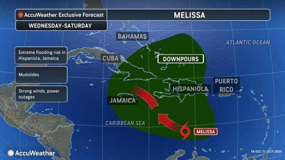 AccuWeather® Global Weather Center – Oct. 21, 2025 – AccuWeather® hurricane experts say Tropical Storm Melissa is expected to strengthen in the Caribbean and bring heavy rainfall, potentially life-threatening and catastrophic flooding, and damaging winds to parts of Haiti, the Dominican Republic, Jamaica, Cuba, and the southern Bahamas starting later this week. Rain and wind is also expected to impact parts of Puerto Rico.