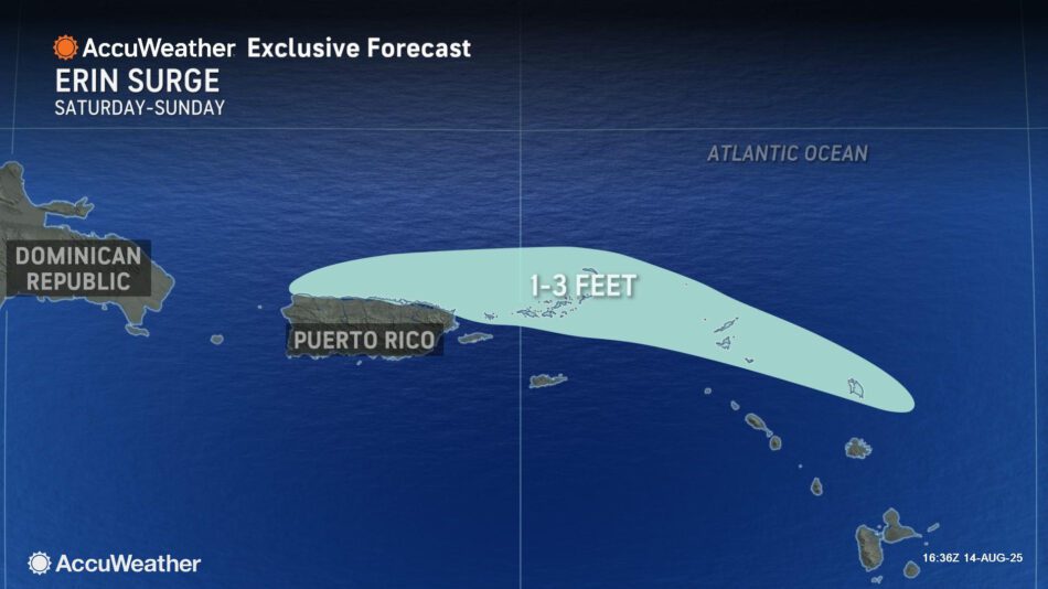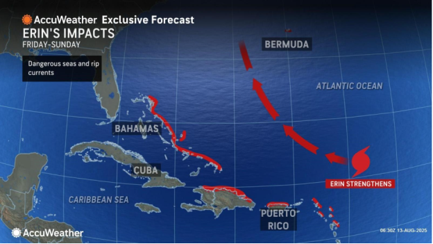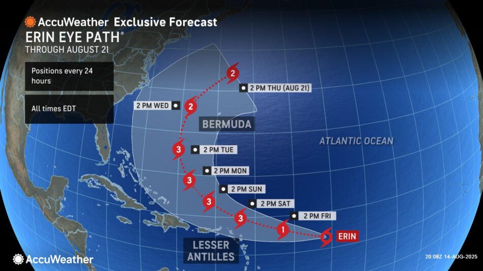 AccuWeather® Global Weather Center – Aug. 14, 2025 – Tropical Storm Erin is forecast to intensify into a hurricane over the next 24 hours before bringing wind, rain and storm surge impacts to parts of the Caribbean this weekend and Bermuda next week.
