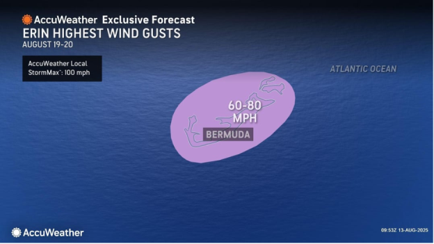 Erin may bring wind gusts of 40-60 mph, with an AccuWeather Local StormMax™ of 80 mph, from the northern Leeward Islands to the Turks and Caicos Islands this weekend into early next week. As Erin tracks northward next week and passes west of Bermuda, wind gusts are forecast to reach 60–80 mph, with an AccuWeather Local StormMax™ of 100 mph. These winds may cause tree and power line damage, leading to localized power outages.