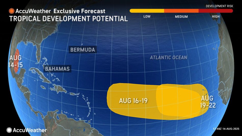 Additionally, forecasters are tracking another low risk area for tropical development in the eastern and central Atlantic from Aug. 19-22.