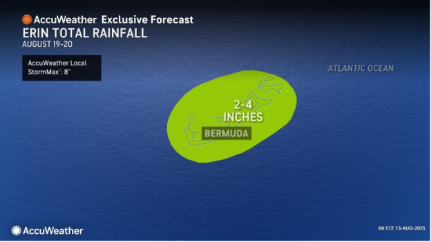 Erin is forecast to track near Bermuda next week as it moves northward. Rainfall amounts are expected to reach 2-4 inches, with an AccuWeather Local StormMax™ of 8 inches.