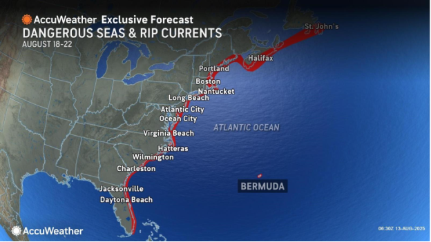 Heavy rain may also impact Bermuda next week as Erin progresses northward. General rainfall totals are expected to reach 2-4 inches, with an AccuWeather Local StormMax™ of 8 inches.
