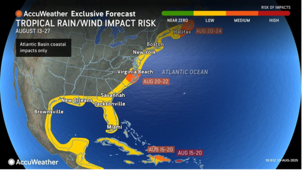 AccuWeather® hurricane experts are forecasting a low risk for tropical development across the eastern and central Atlantic from Aug. 16-19. As this feature moves westward across the Atlantic, it will need to be monitored for potential impacts on the Caribbean.