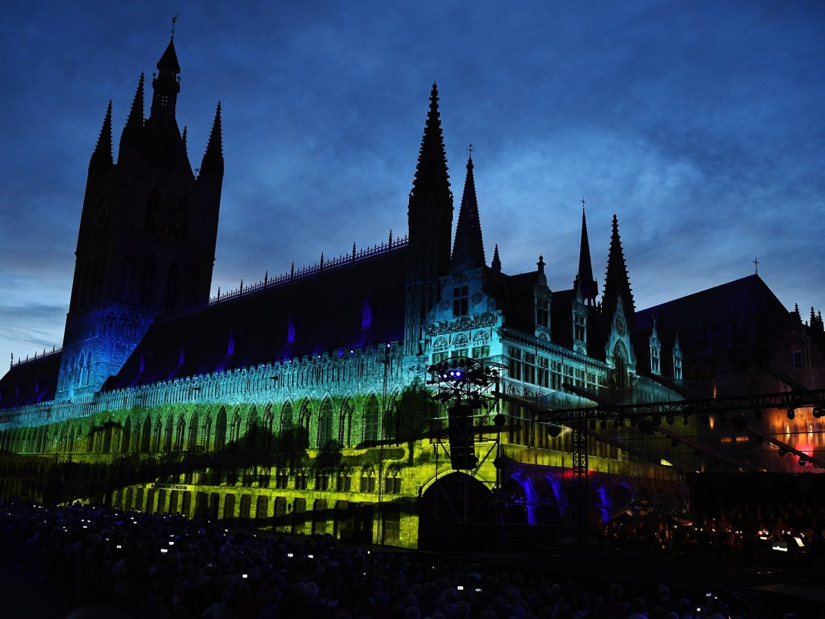 The story of the war in the Ypres region is told by performances and music set to a backdrop of visual projections on the facade of the Cloth Hall during commemorations marking the centenary of Passchendale on July 30, 2017 in Ypres, Belgium.Leon Neal/Getty Images