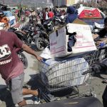 People drag a shopping trolley with goods looted from a supermarket in Palu. Photo: 30 September 2018Image copyrightEPA