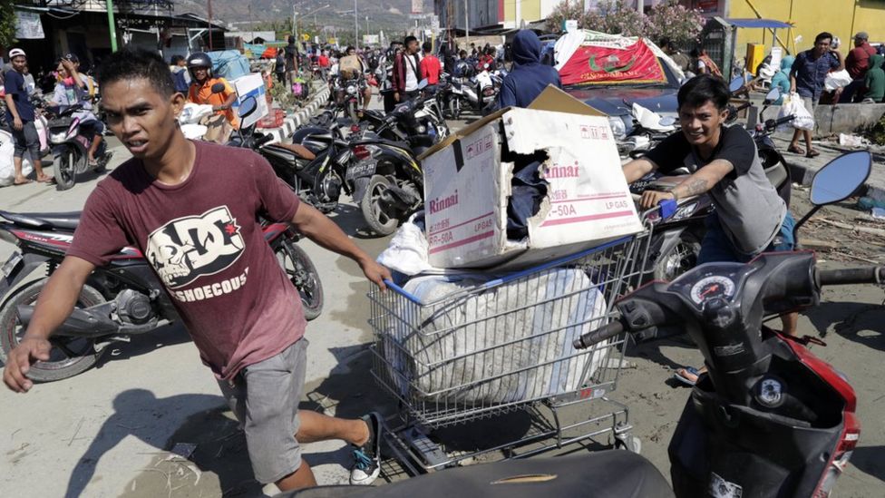 People drag a shopping trolley with goods looted from a supermarket in Palu. Photo: 30 September 2018Image copyrightEPA