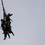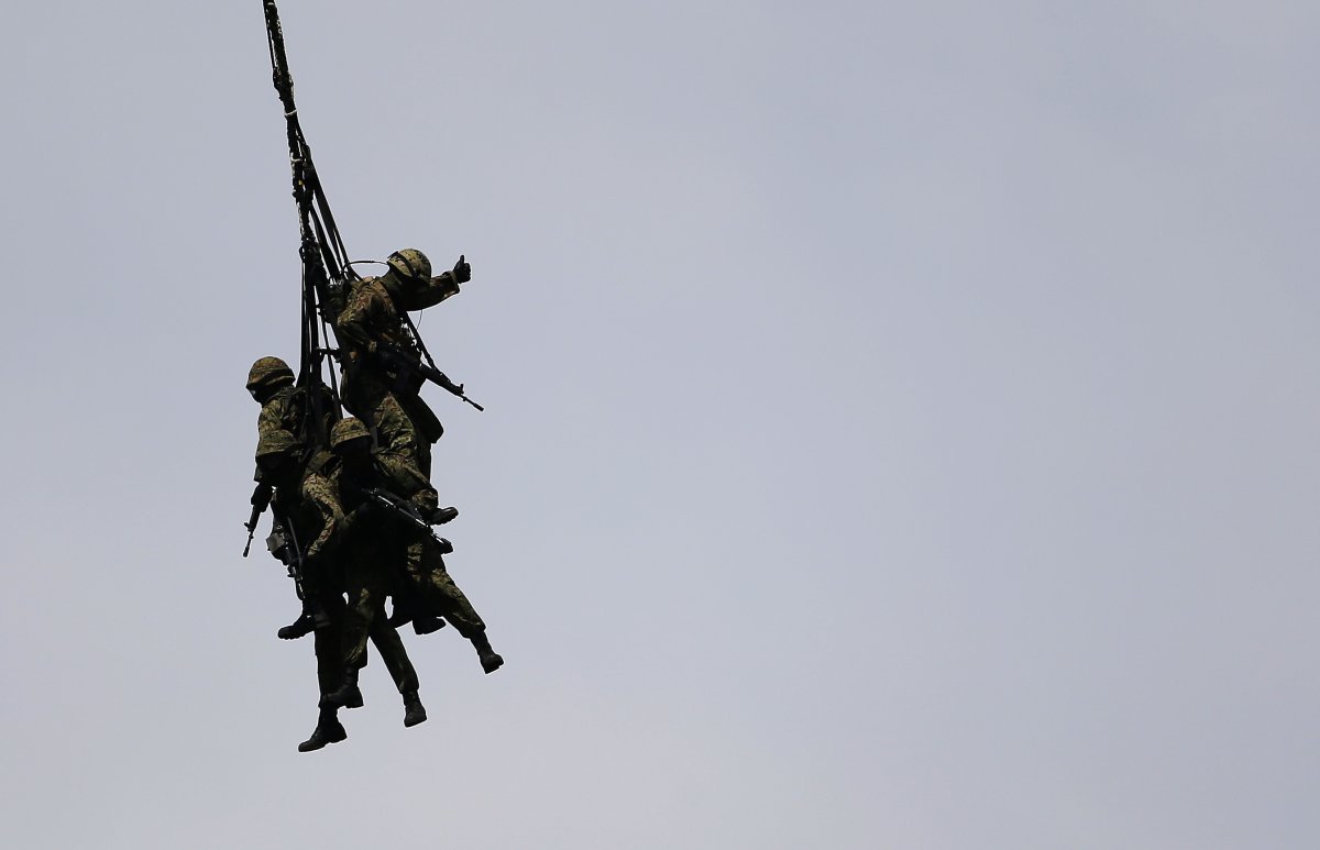 Over in Japan, members of the Ground Self-Defense Forces practice holding onto a rope dangling from a cargo helicopter.