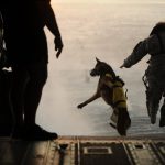 Here, a US soldier in the 10th Special Forces Group jumps off the ramp of a Chinook helicopter with his military working dog during an exercise.