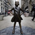 People are seen around a sculpture titled ‘The Fearless Girl’ by artist Kristen Visbal which was installed overnight facing the famous sculpture of the charging bull in Lower Manhattan. A big investment firm, State Street Global Advisors, put the statue there to highlight International Women’s Day. (JUSTIN LANE/EPA)