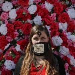 Hillary Harper stands in front of a wall decorated with artificial flowers during “A Day Without a Woman” protest in Los Angeles. Many American women stayed home from work, joined rallies or wore red Wednesday to demonstrate how vital they are to the U.S. economy. (Jae C. Hong/Associated Press)