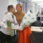 Alice Rossiter, left, CEO of Alice’s Table, thanks Techstars director Eveline Buchatskiy for a bouquet of tulips in Boston. Buchatskiy canceled work for her female employees and delivered flowers to other businesswomen as a gesture to acknowledge “A Day Without a Woman.” (Pat Greenhouse/Globe Staff)