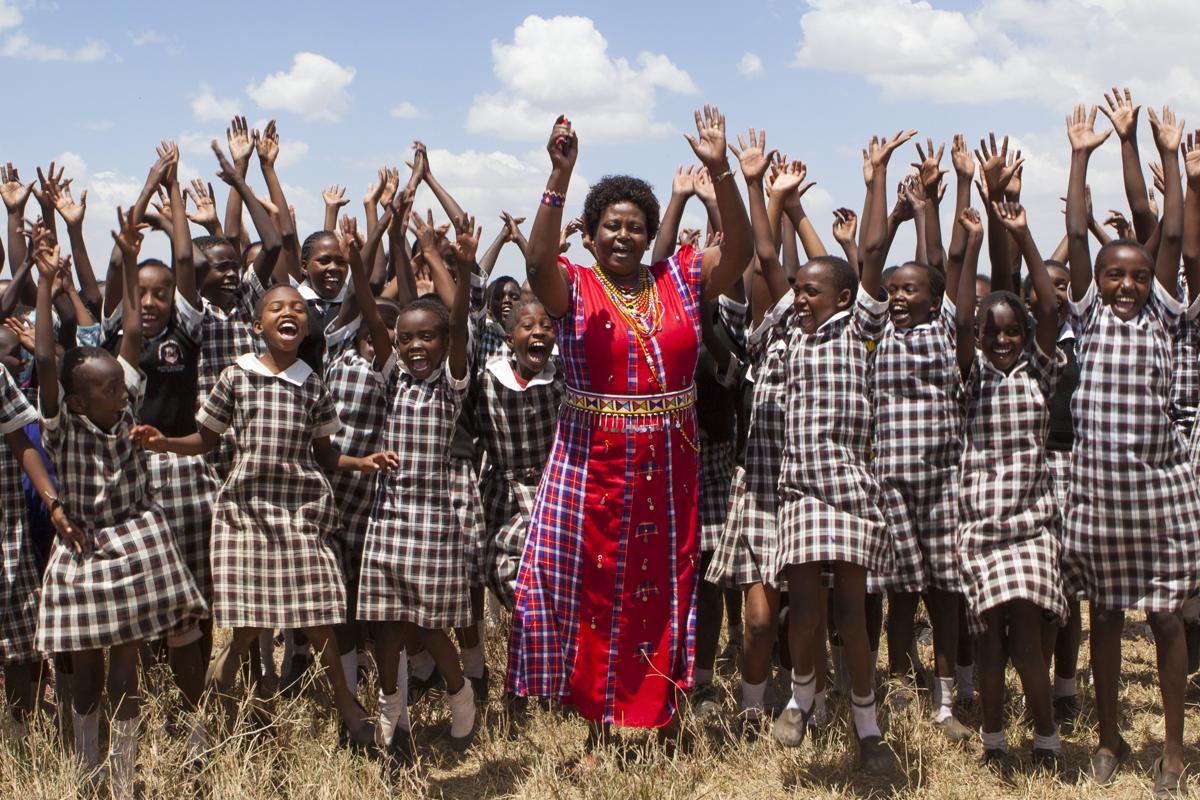 Founder of Nanana Winbridge Education Center, Priscilla Nangurai (C) stands with 58 rescued girls at the school in Kajiado, Kenya. Nangurai established the Nanana Winbridge Education Center in 2007 with her retirement money where she hosts rescued girls who’ve run away from home to escape Female Genital Mutilation (FGM). She has rescued 825 girls since 1986. (DANIEL IRUNGU/EPA)