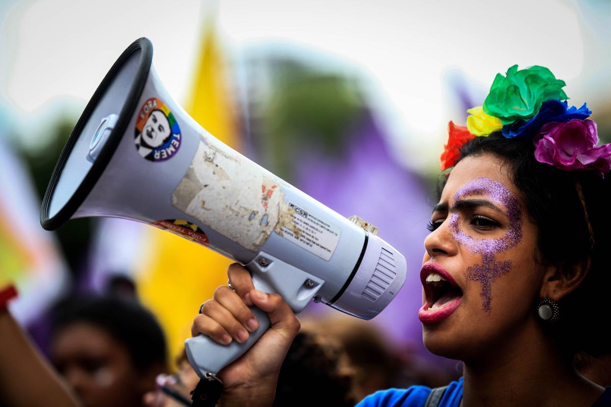 A woman shouts slogans in a rally to commemorate the International Women’s Day in Sao Paulo, Brazil. (Fernando Bizerra/EPA)