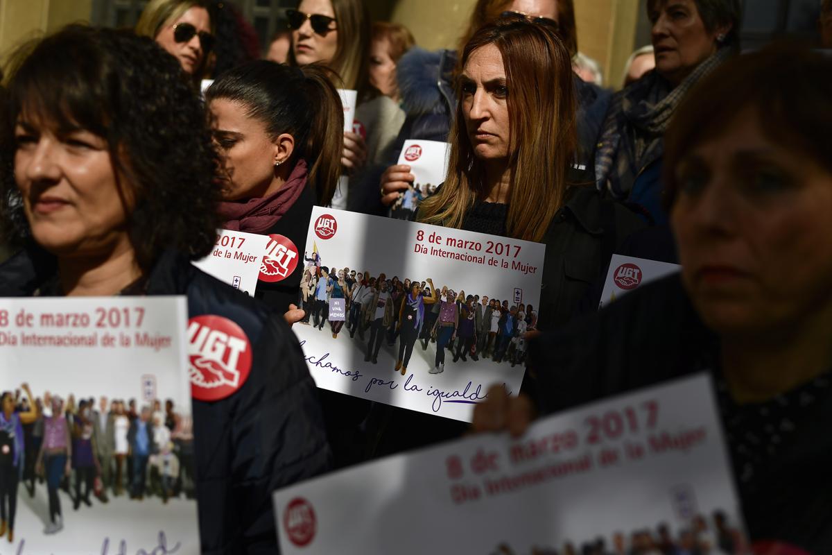 Female workers from a Spanish trade union stand outside their main headquarters after a call for women to stop working for half an hour at noon to commemorate International Women’s Day, in Pamplona, northern Spain. (Alvaro Barrientos/Associated Press)