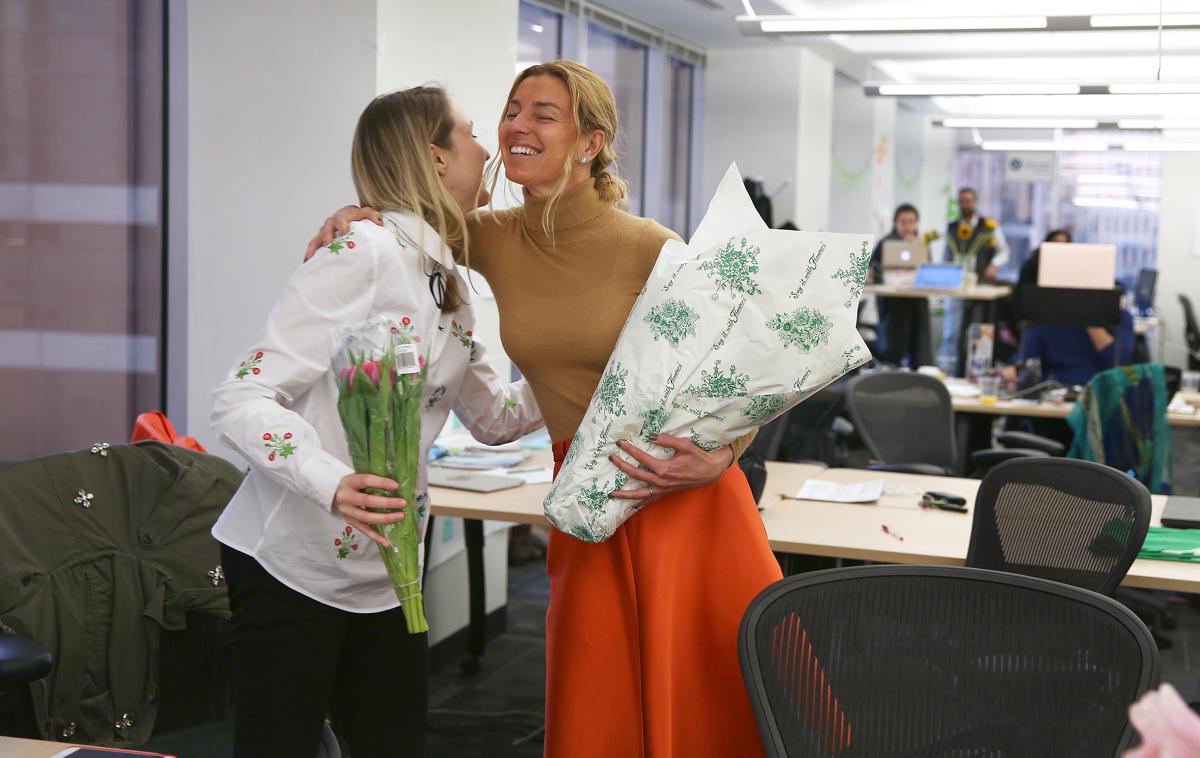 Alice Rossiter, left, CEO of Alice’s Table, thanks Techstars director Eveline Buchatskiy for a bouquet of tulips in Boston. Buchatskiy canceled work for her female employees and delivered flowers to other businesswomen as a gesture to acknowledge “A Day Without a Woman.” (Pat Greenhouse/Globe Staff)