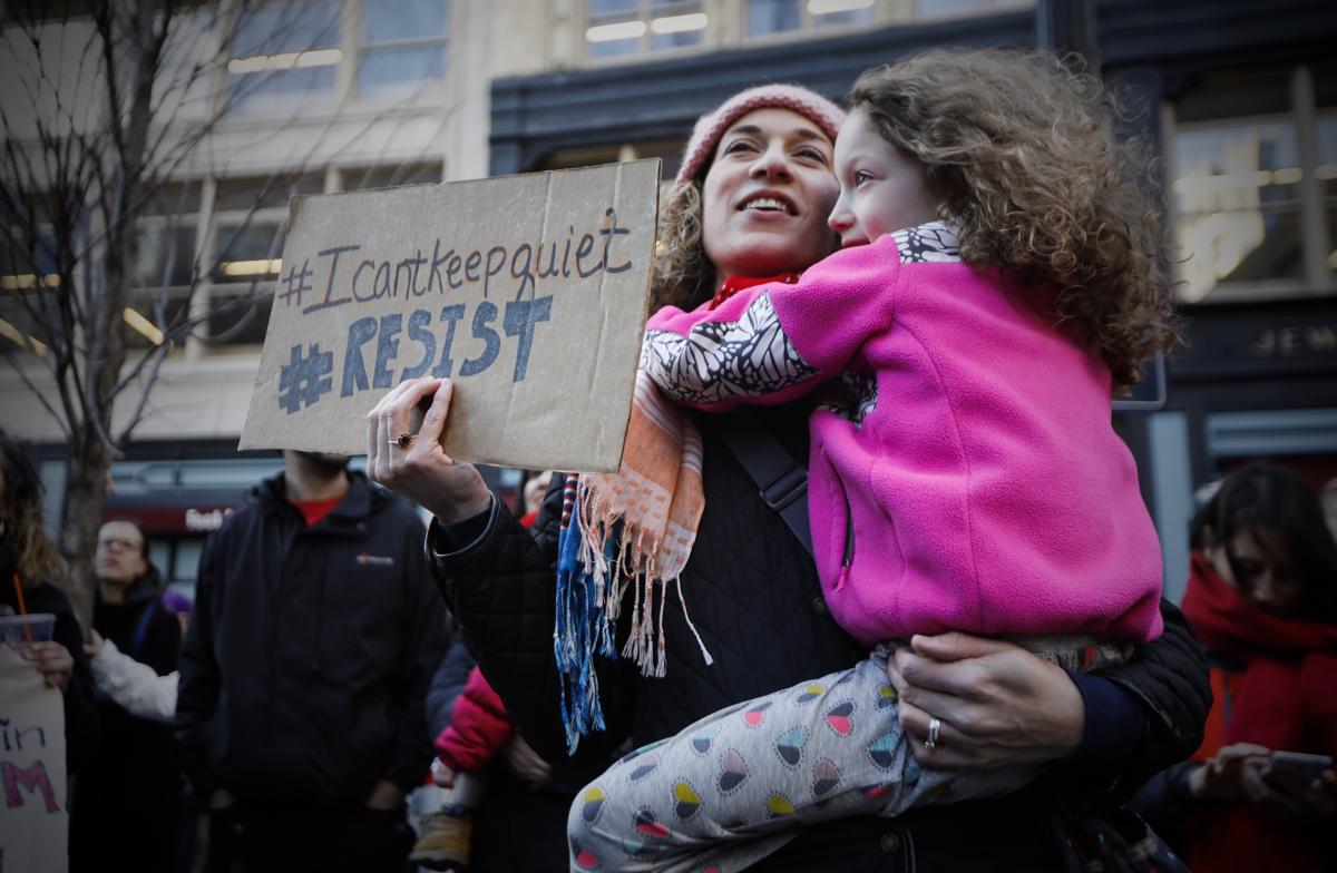 Jennifer Jones holds her daughter Meredith,6, as she takes part in “A Day Without a Woman” rally in Downtown Crossing in Boston, Mass. (Keith Bedford/Globe Staff)