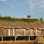 Indigenous men sewing a thatched for a community building powered by a little solar panel in Masakenyari, Guyana – Photography by Ajay Bash