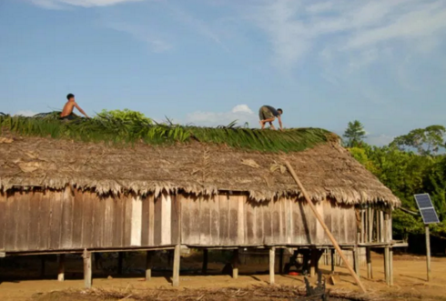 Indigenous men sewing a thatched for a community building powered by a little solar panel in Masakenyari, Guyana – Photography by Ajay Bash