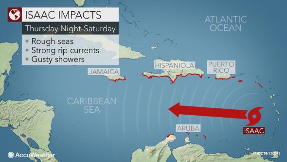 Isaac will pass through the Lesser Antilles on Thursday near Dominica and Martinique then continue on a westward path through the Caribbean into Sunday.