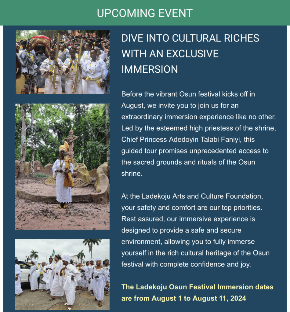 As we look ahead, we are thrilled to share with you the exciting projects and initiatives we have in store, including the revitalization of the Osun Heritage House serving as a shrine, learning center and living museum in Nigeria — a significant endeavor that embodies our dedication to honoring our traditions while embracing progress and innovation.