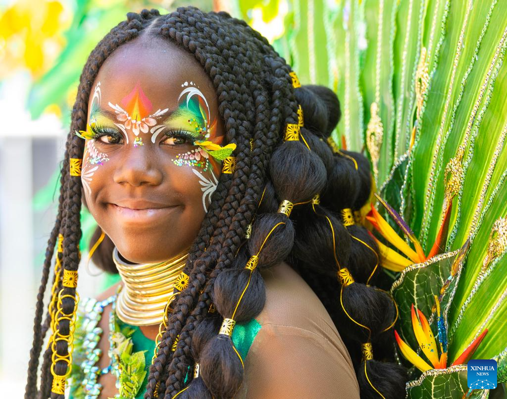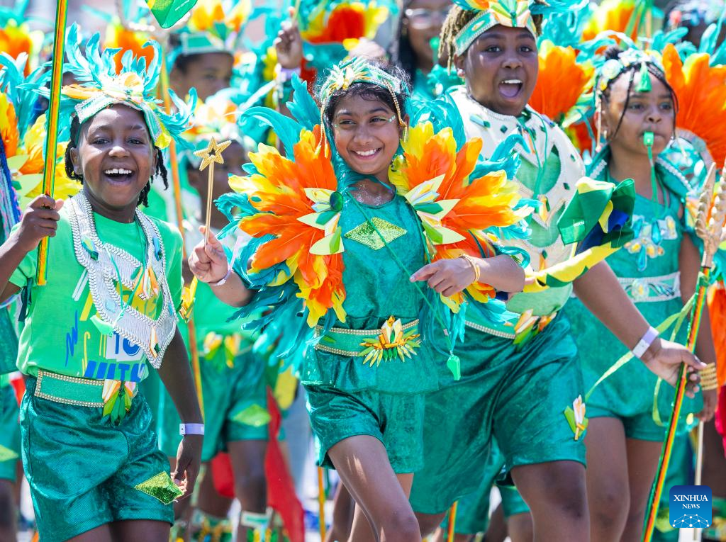 Dressed-up participants are pictured during the Junior Carnival Parade of the 2025 Toronto Caribbean Carnival in Toronto, Canada, on July 19, 2025. The annual event kicked off here on Saturday with thousands of young participants in vibrant costumes celebrating Caribbean culture with music and dance. (Photo by Zou Zheng/Xinhua)