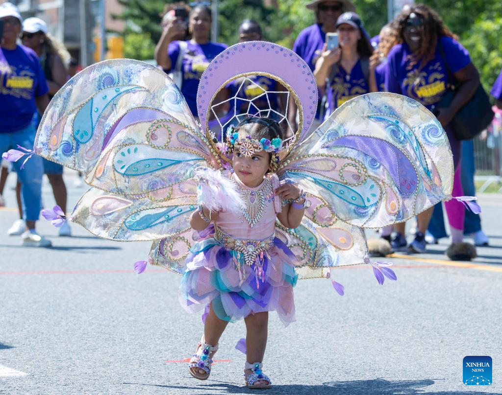 A dressed-up little girl dances during the Junior Carnival Parade of the 2025 Toronto Caribbean Carnival in Toronto, Canada, on July 19, 2025. The annual event kicked off here on Saturday with thousands of young participants in vibrant costumes celebrating Caribbean culture with music and dance. (Photo by Zou Zheng/Xinhua)