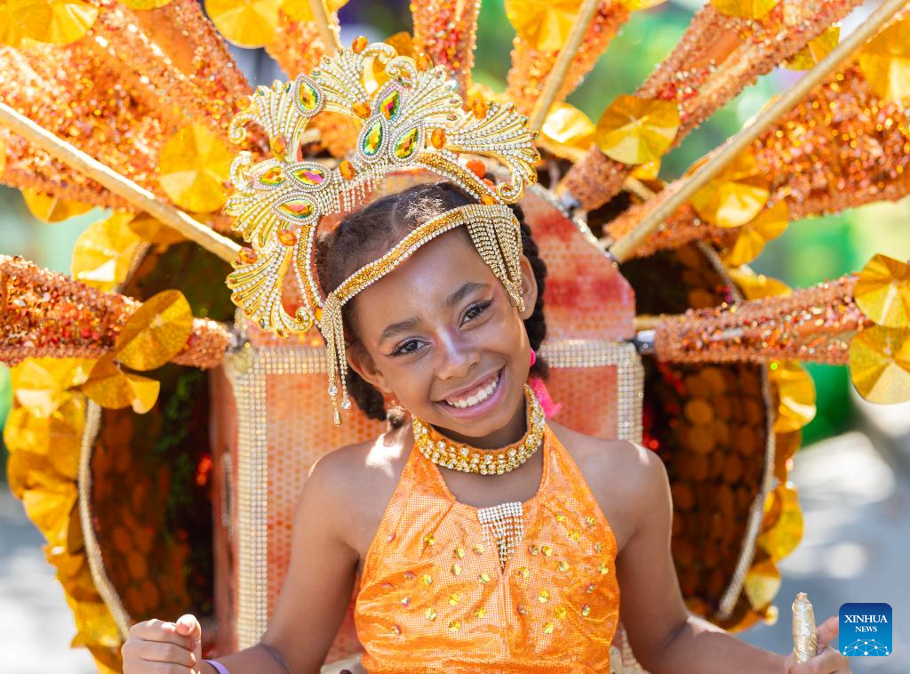 A dressed-up girl dances with her float during the Junior Carnival Parade of the 2025 Toronto Caribbean Carnival in Toronto, Canada, on July 19, 2025. The annual event kicked off here on Saturday with thousands of young participants in vibrant costumes celebrating Caribbean culture with music and dance. (Photo by Zou Zheng/Xinhua)