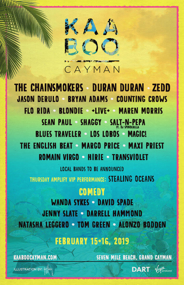 Grand Cayman, Cayman Islands (May 15, 2018) – KAABOO is proud to announce the 2019 lineup for its newest destination event, a multi-sensory experience in the Cayman Islands. KAABOO Cayman, set to take place February 15 + 16, 2019, welcomes internationally renowned EDM-pop duo The Chainsmokers and British new wave idols Duran Duran as headliners for its inaugural event overlooking the Caribbean Sea. Russian-German producer and DJ ZEDD, Pop-RnB platinum-selling artist Jason Derulo, Canadian super-star Bryan Adams and American rock band Counting Crows, join a multi-generational lineup including Flo Rida, Blondie, +Live+, Maren Morris, Sean Paul, Shaggy, Salt-N-Pepa ft DJ Spinderella, Blues Traveler, Los Lobos, and many more. Comic canons Wanda Sykes, David Spade,Jenny Slate, Darrell Hammond and more will headline KAABOO’s HUMOR ME stage. A confirmed listing of KAABOO Cayman’s music and comedy lineup is below.