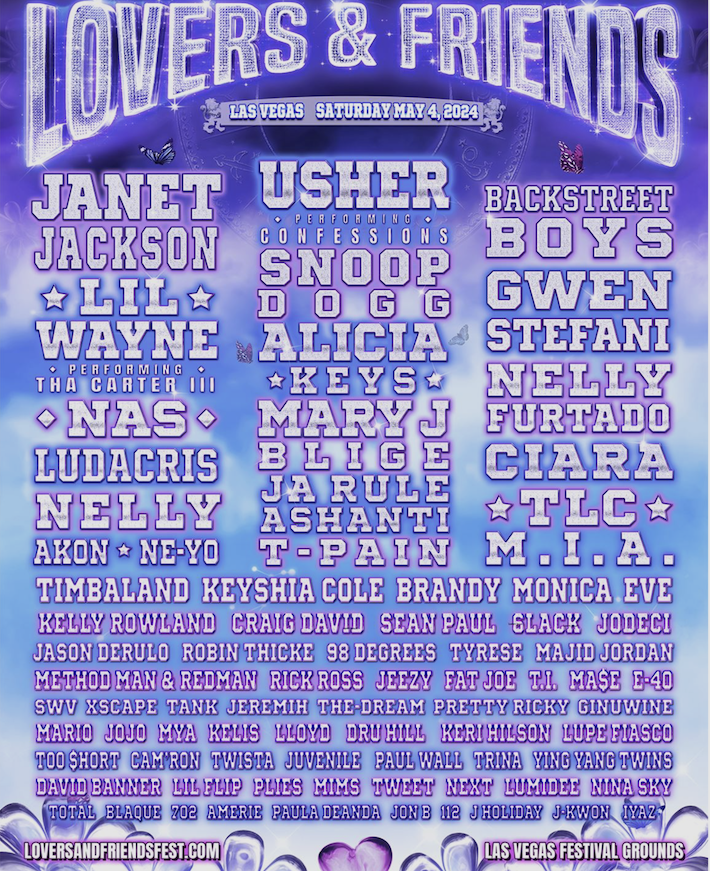 USHER, Janet Jackson and Backstreet Boys will lead the third edition of Lovers & Friends, returning to the Las Vegas Festival Grounds on May 4, 2024. The powerhouse lineup will treat fans to performances from Lil Wayne, Snoop Dogg, Gwen Stefani, Nas, Alicia Keys, Nelly Furtado, Ludacris, Mary J. Blige, Ciara, TLC, Timbaland and many more. For more information, contact Nicole Easley, C3 Presents, [email protected].