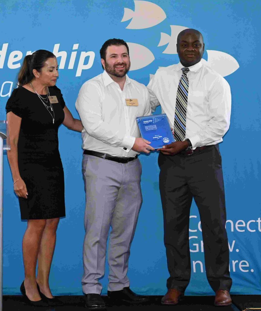 Joshua Bain receives his Graduation Plaque from Chamber President-Elect, Cristina Spratt (Left) and Leadership Cayman Chair, James Robinson