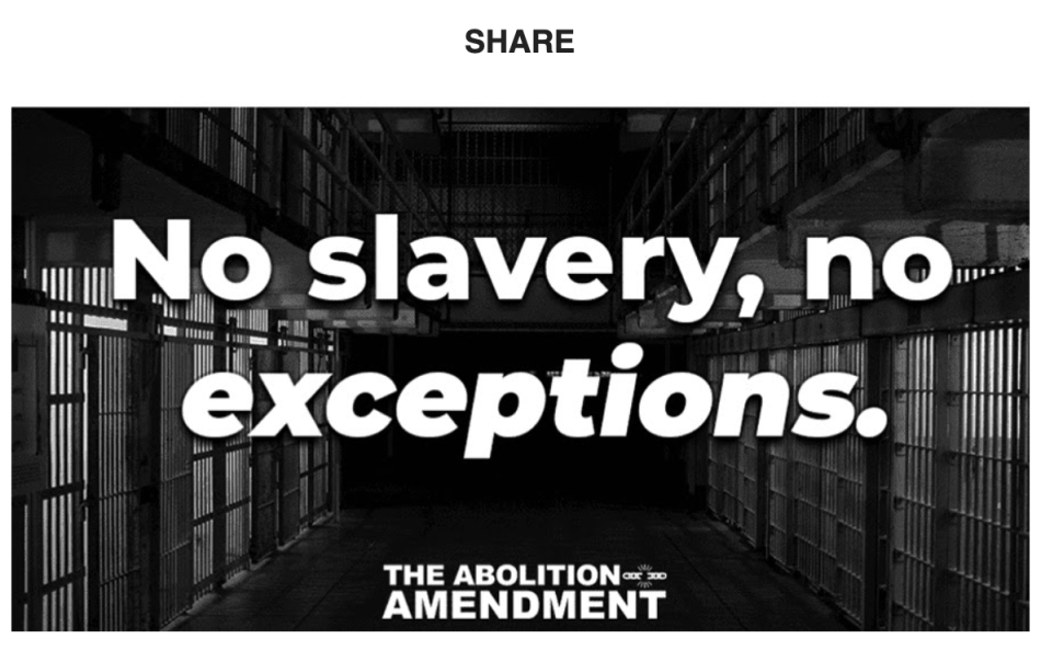 The heart of our campaign beats in unison with the anti-slavery community, urging Congress to pass the Abolition Amendment (SJR 33/HJR 72)[1] which boldly declares an end to the exception — a declaration that unequivocally denounces the insidious practice of slavery in any guise.