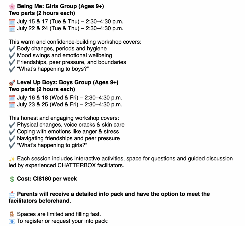 Puberty can be a confusing and emotional time—for both kids and parents. That’s why CHATTERBOX is proud to offer two safe, supportive and practical workshops this July, specially designed for children aged 9 and up.